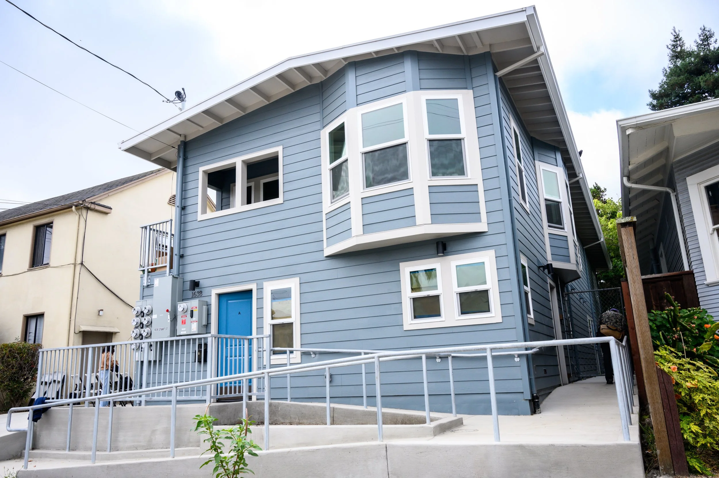 We broke ground with the ceremony shown above in September 2019, and new residents move in September 1, 2022. The renovation involved complete rebuilding of the structure. All plumbing, electrical and windows were replaced. A new roof was installed with 38 solar panels. Utilities were converted to all electric with high efficiency appliances. There are 7 one bedroom apartments and one studio. One apartment is fully ADA accessible. Most of the residents are people of color, many of whom were able to remain in South Berkeley.